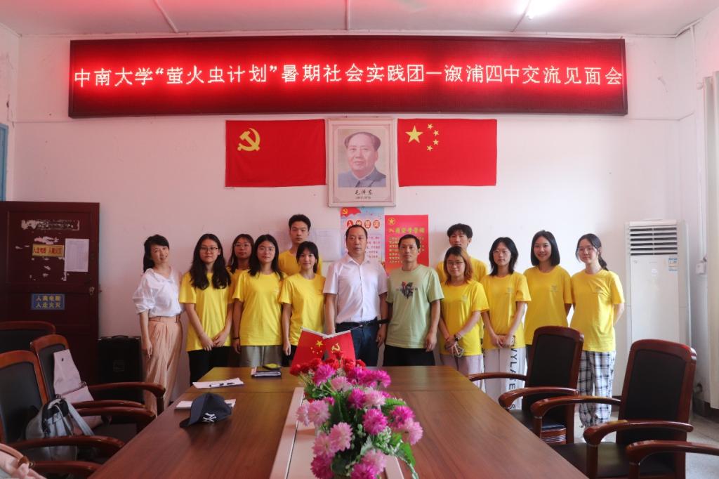 (中南大学“萤火虫”计划实践团成员与溆浦四中李校长、黄校长合影)