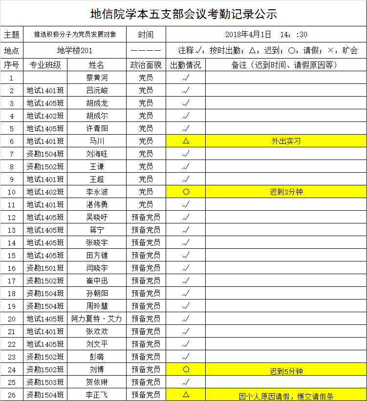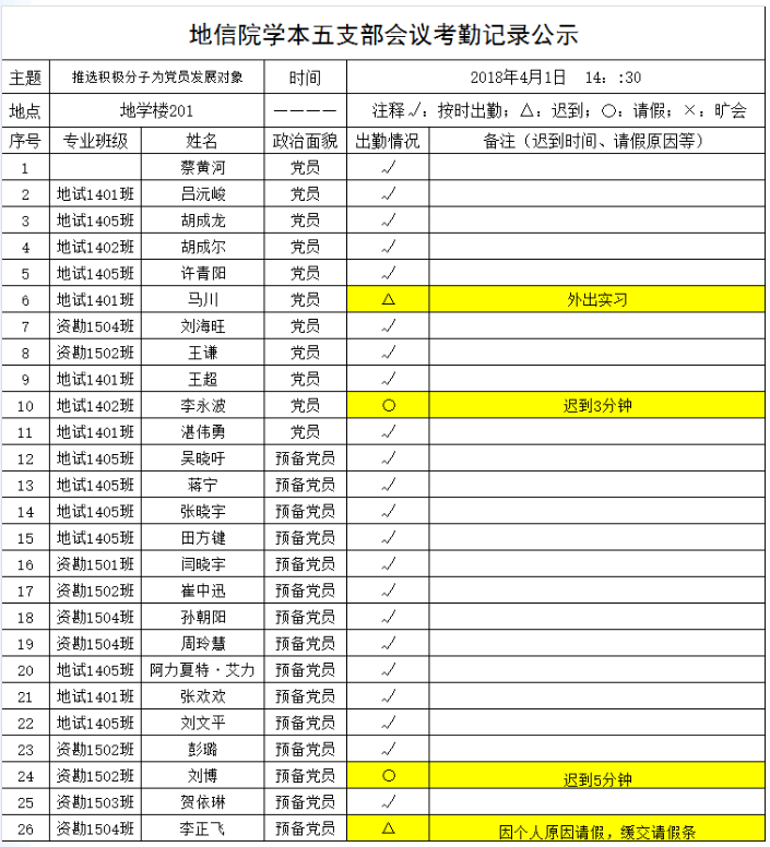 2018年4月1日下午,yl6809永利官网学本五支部召开支部党员大会,讨论发展对象事宜。将出勤情况公示如下,接受党内外群众监督。